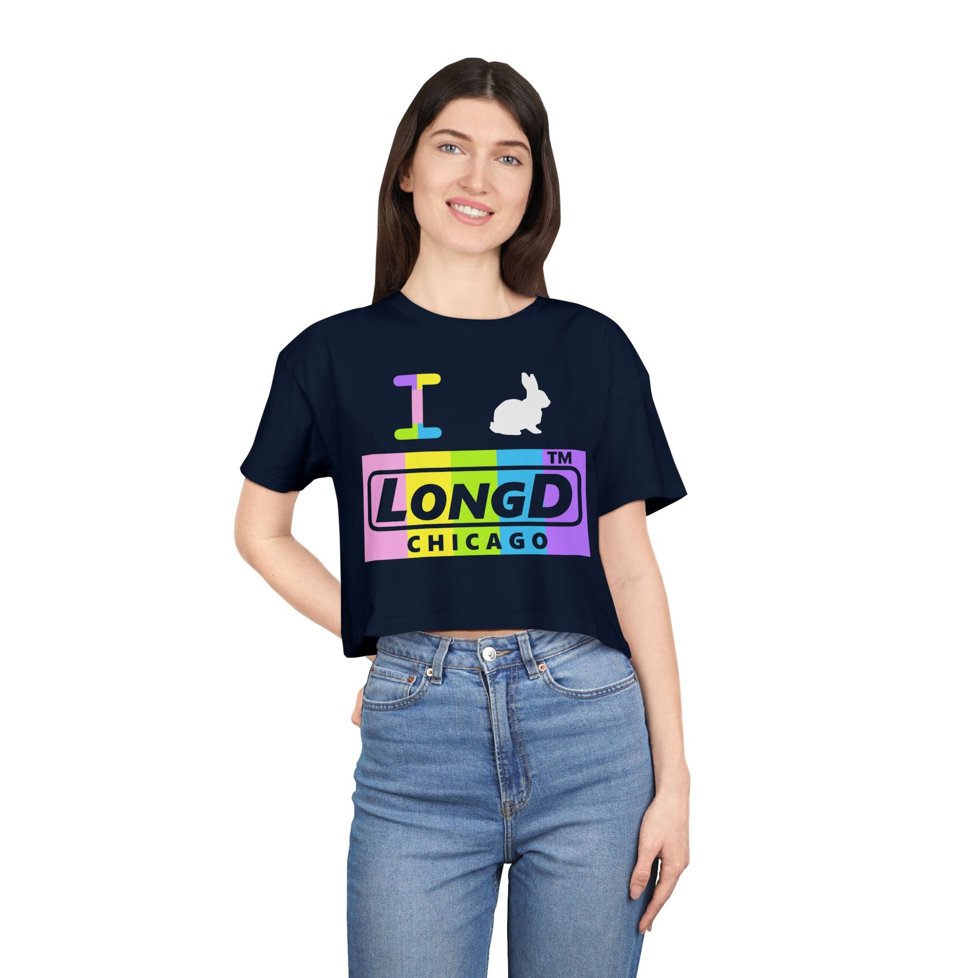 I Bunny LongD negative vertical striped Chicago Logo Crop Tee